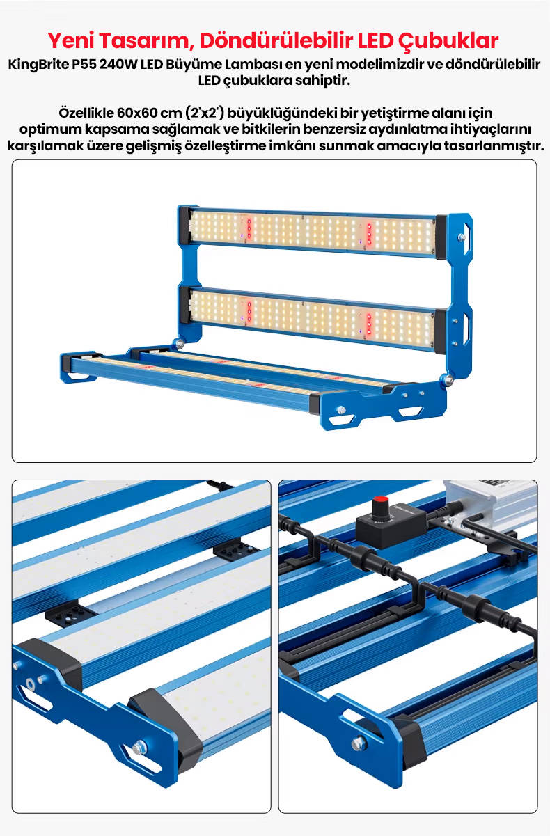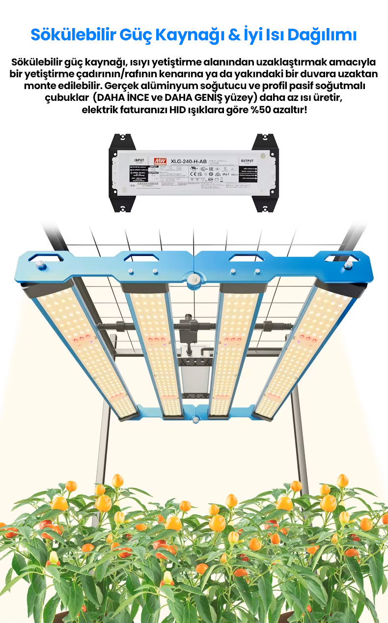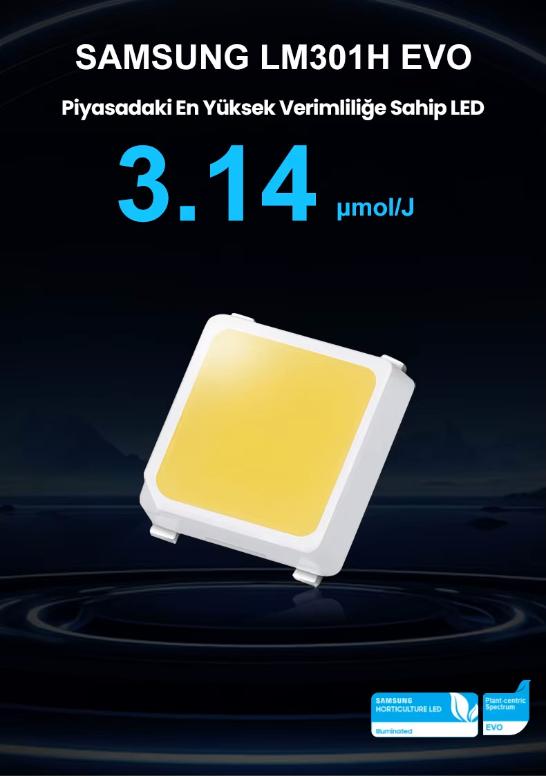 Bitkilerinizin sağlıklı ve verimli büyümesi için geliştirilen bu LED yetiştirme lambası, güçlü Samsung LM301H çipleri ile donatılmıştır. Fide döneminden, hasat dönemine kadar tüm süreçlere uygundur.