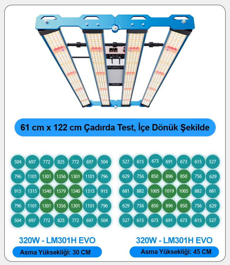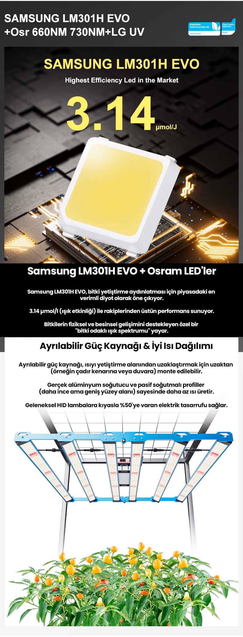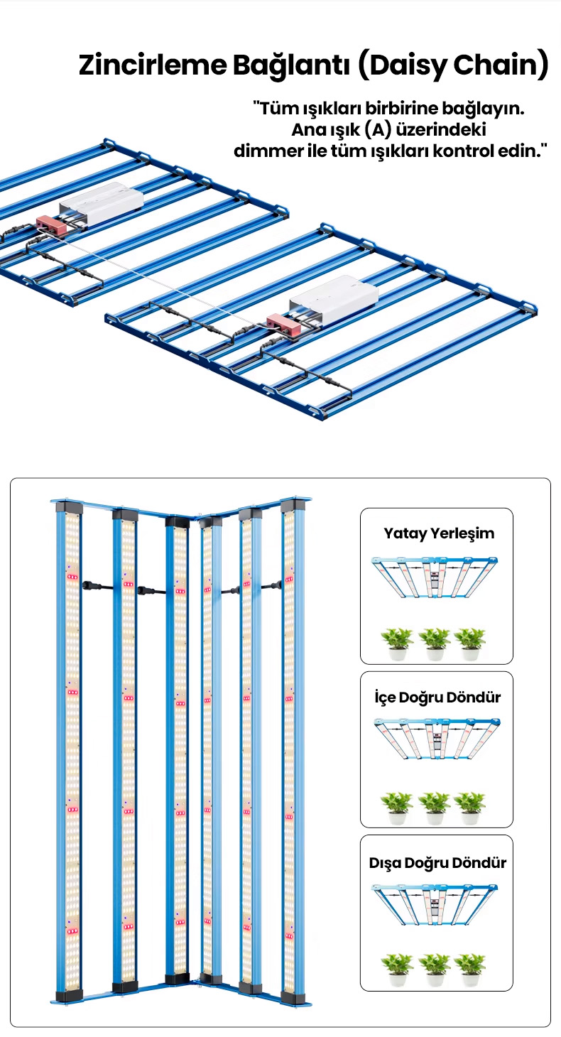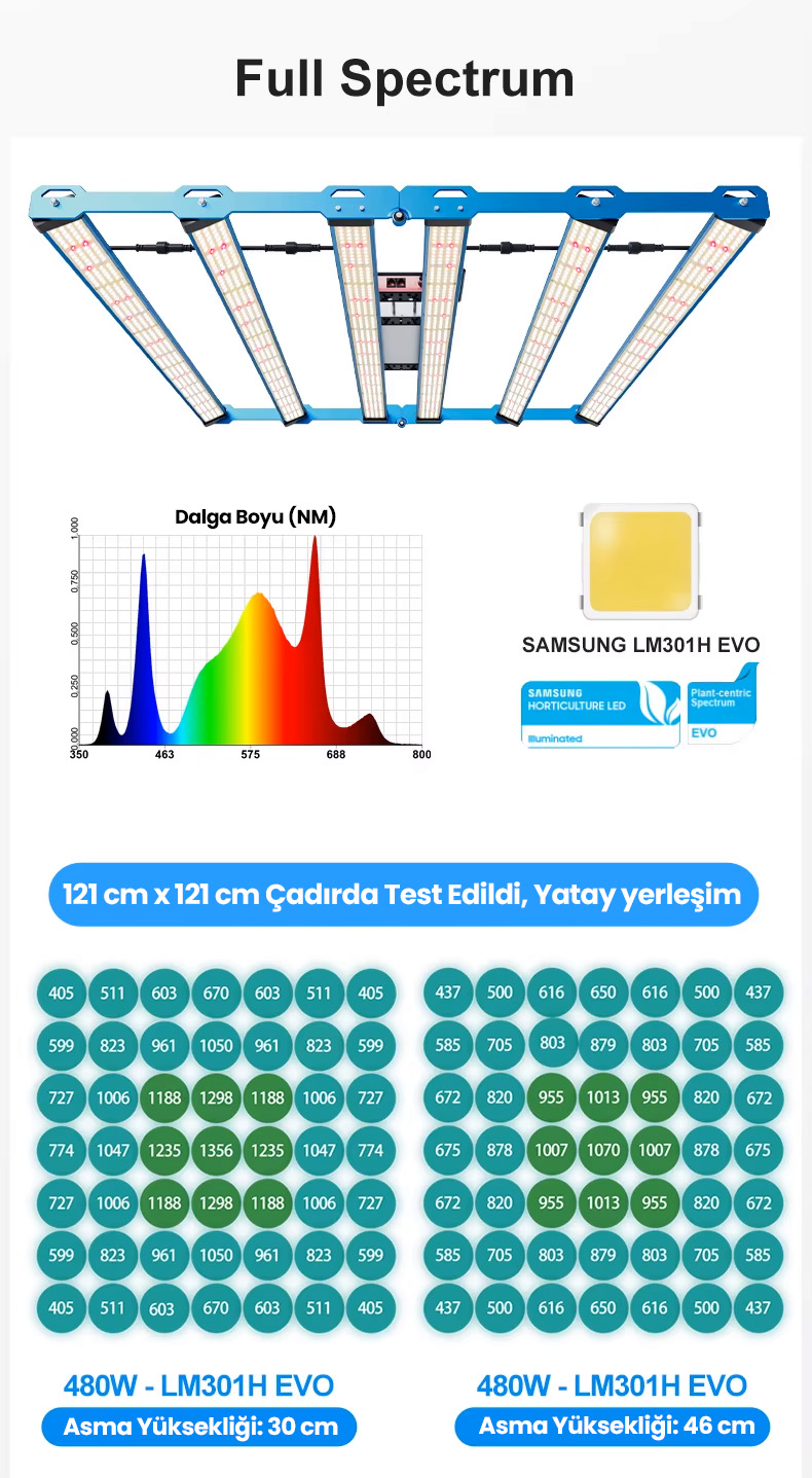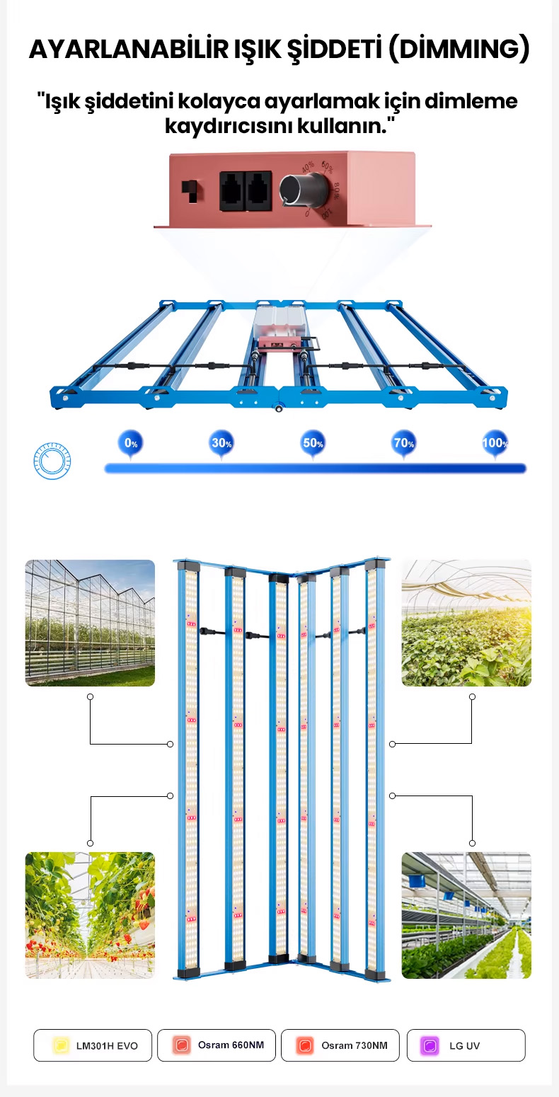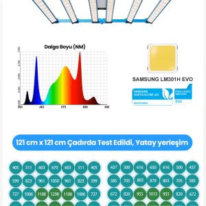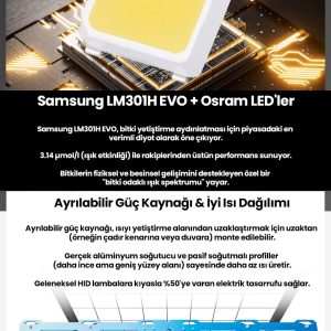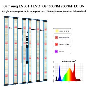 Osram 660nm ve 730nm kızılötesi (IR) LED’ler ile LG UV LED barlar sayesinde bitkilerin hem vejetatif (büyüme) hem de çiçeklenme dönemlerinde maksimum verim almanızı sağlar. Fide döneminden, hasat dönemine kadar tüm süreçlere uygundur.